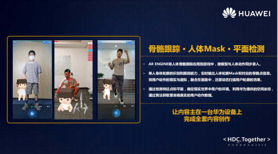 在动作的捕捉过程中,玩家会有一些蹲下、转身、弯腰等等这些动作,普通的AR捕捉可能会对这种动作没办法很精细,有时候会导致动作丢失、不真实,或者跳跃的感觉。迷你玩跟华为的AR技术专家做了深度的沟通交流,接入了平面检测、人体Mask的能力,该技术可以在整个过程中对一些动作做出预判,根据人物的运行轨迹算出一些方程式来预测下一个动作,在用户使用时无论是转身、蹲下还是弯腰等动作,都可以很顺畅的去表现出来,从而让动作效果和画面更加真实,更加炫酷,也能让玩家去体验不同的创作过程。